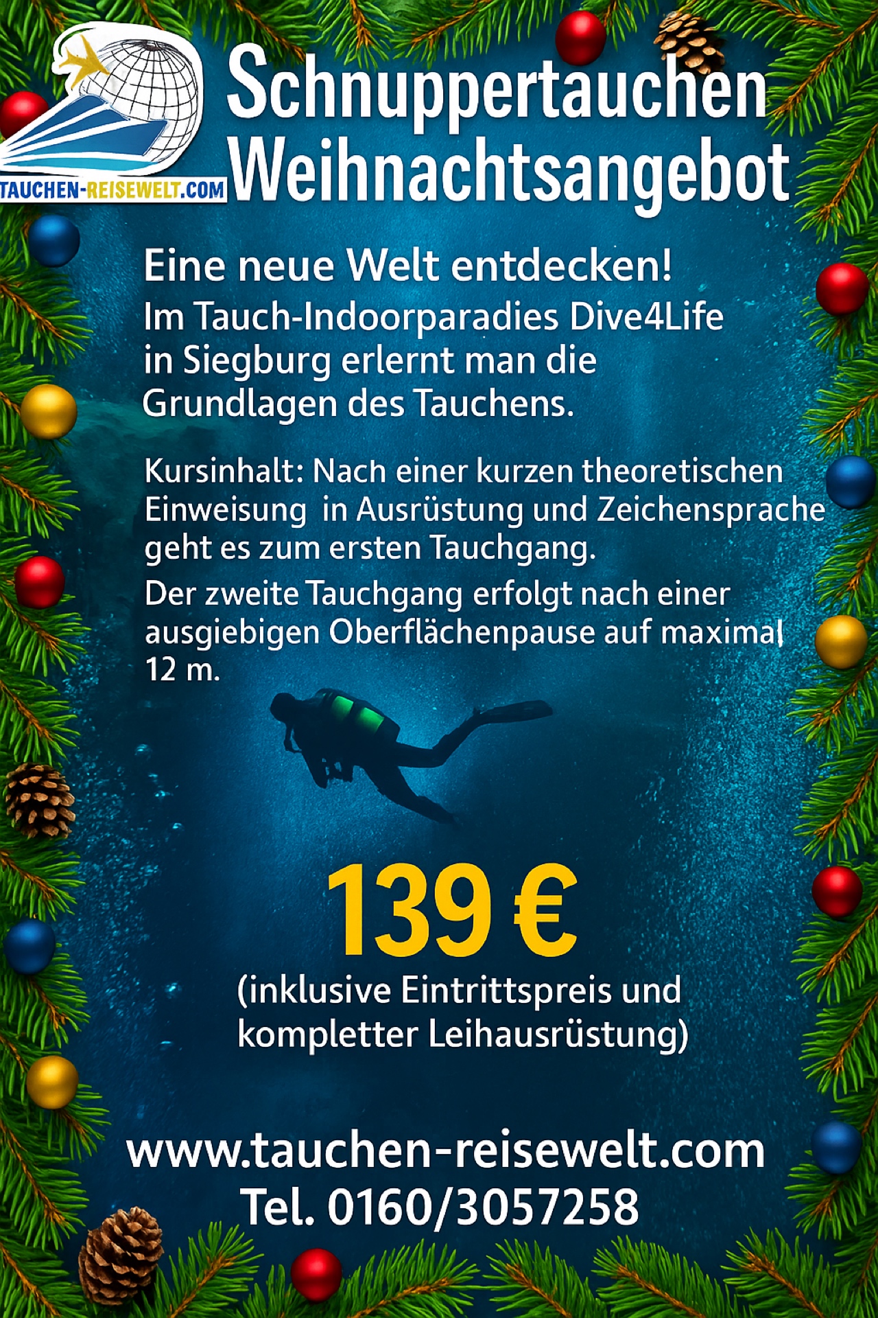 Das besondere Weihnachtsangebot!! Schnuppertauchen im Indoorparadies Dive4Live Siegburg. 139€ inklusive Leihausrüstung. Bei einer Wassertemperatur von 27 Grad im 18m tiefen Tauchbecken des Dive4Live, erlebt man die Faszination des Tauchens. Die Tauchlandschaft im Tauchbecken des Dive4Live wurde liebevoll gestaltet und ermöglicht vielfältige Taucherlebnisse.